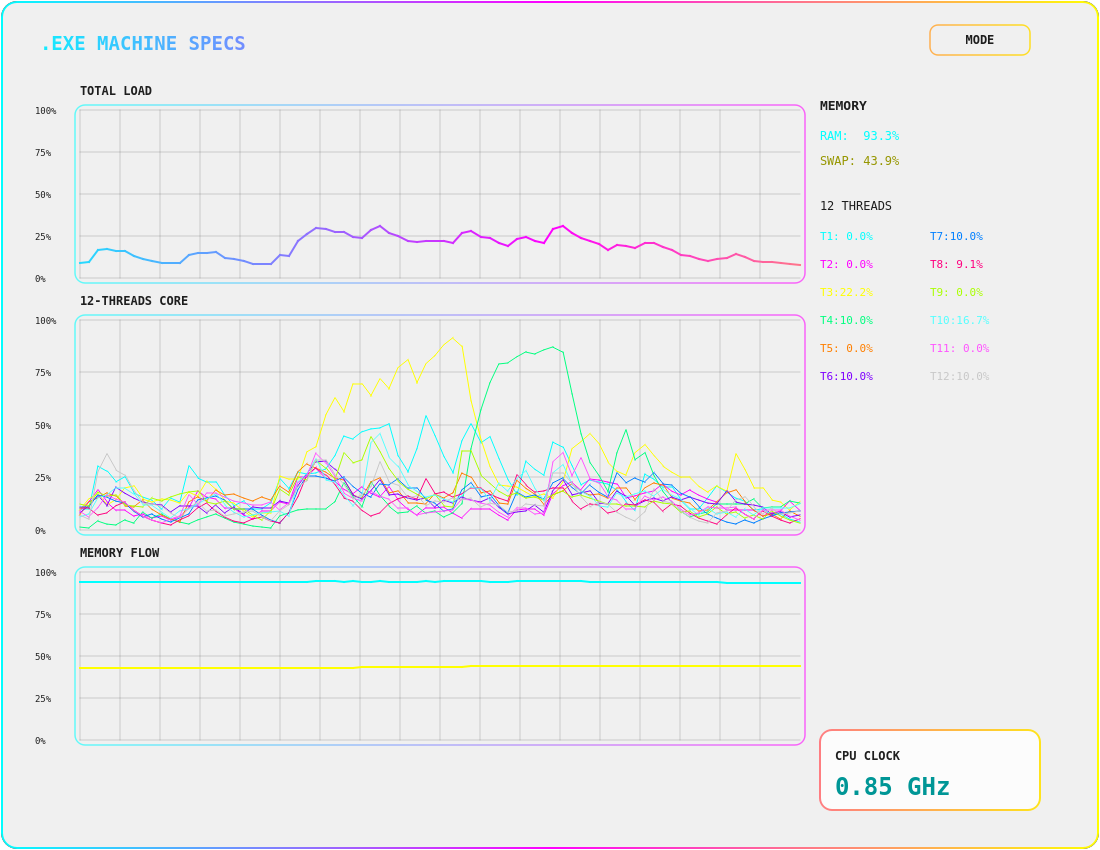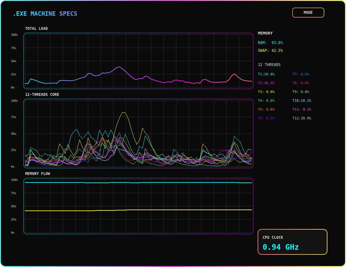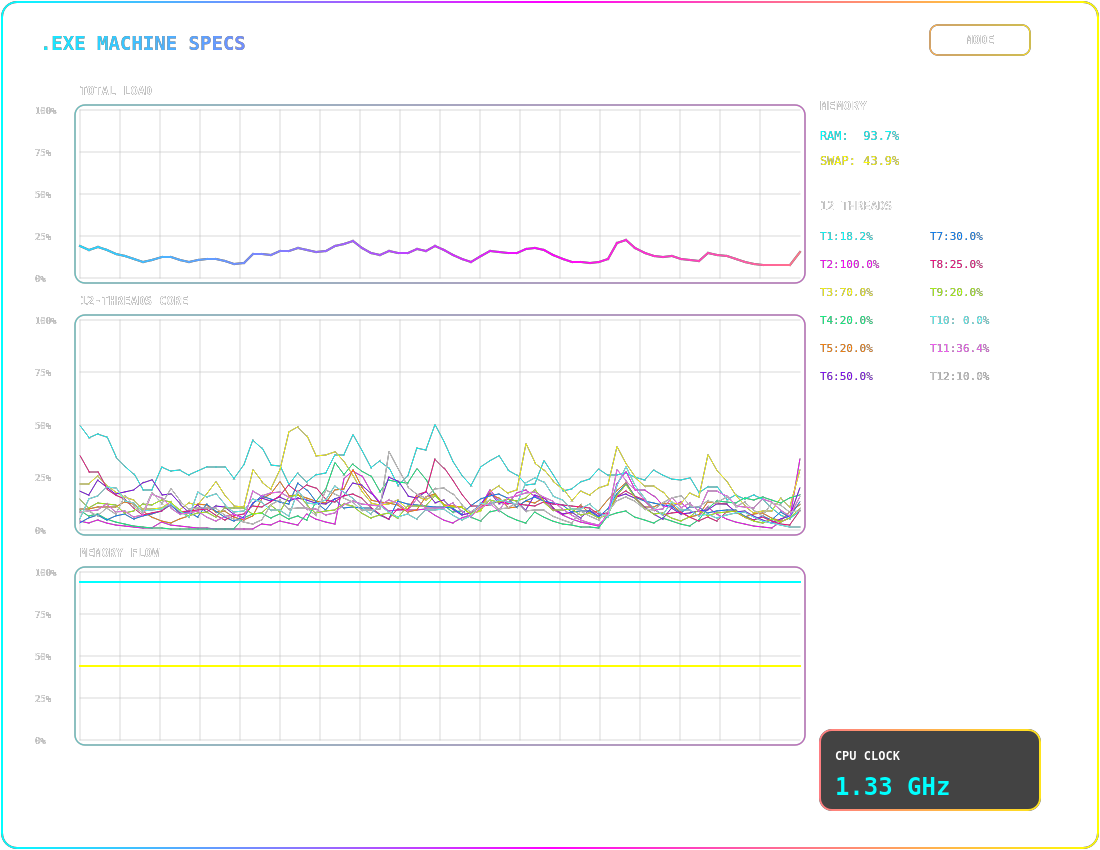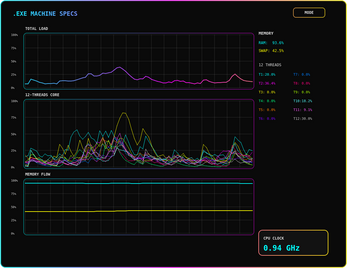 **.EXE Machine Specs** est un moniteur matériel haute fidélité conçu pour les systèmes à 12 threads. Développé pour allier esthétique futuriste et précision technique, il permet de suivre en temps réel la charge des cœurs, la fréquence CPU (GHz) et les flux de mémoire (RAM/SWAP).